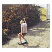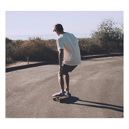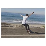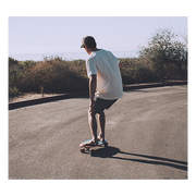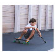 We’ve installed 5.85 inch Independent style trucks on top of our massive 24mm risers so that there’s no wheel bite when you lean in to the full power of this little beast. A portable, packable shorty that you can actually fit both of your feet on so you can cruise. It’s amazingly surfy for such a shorty.