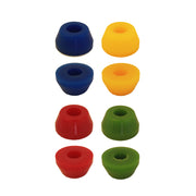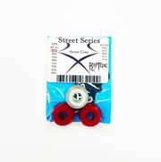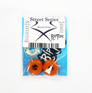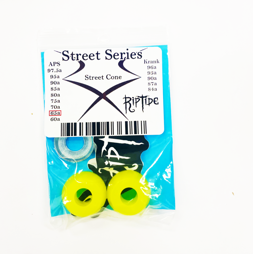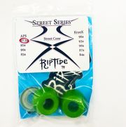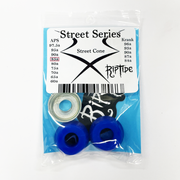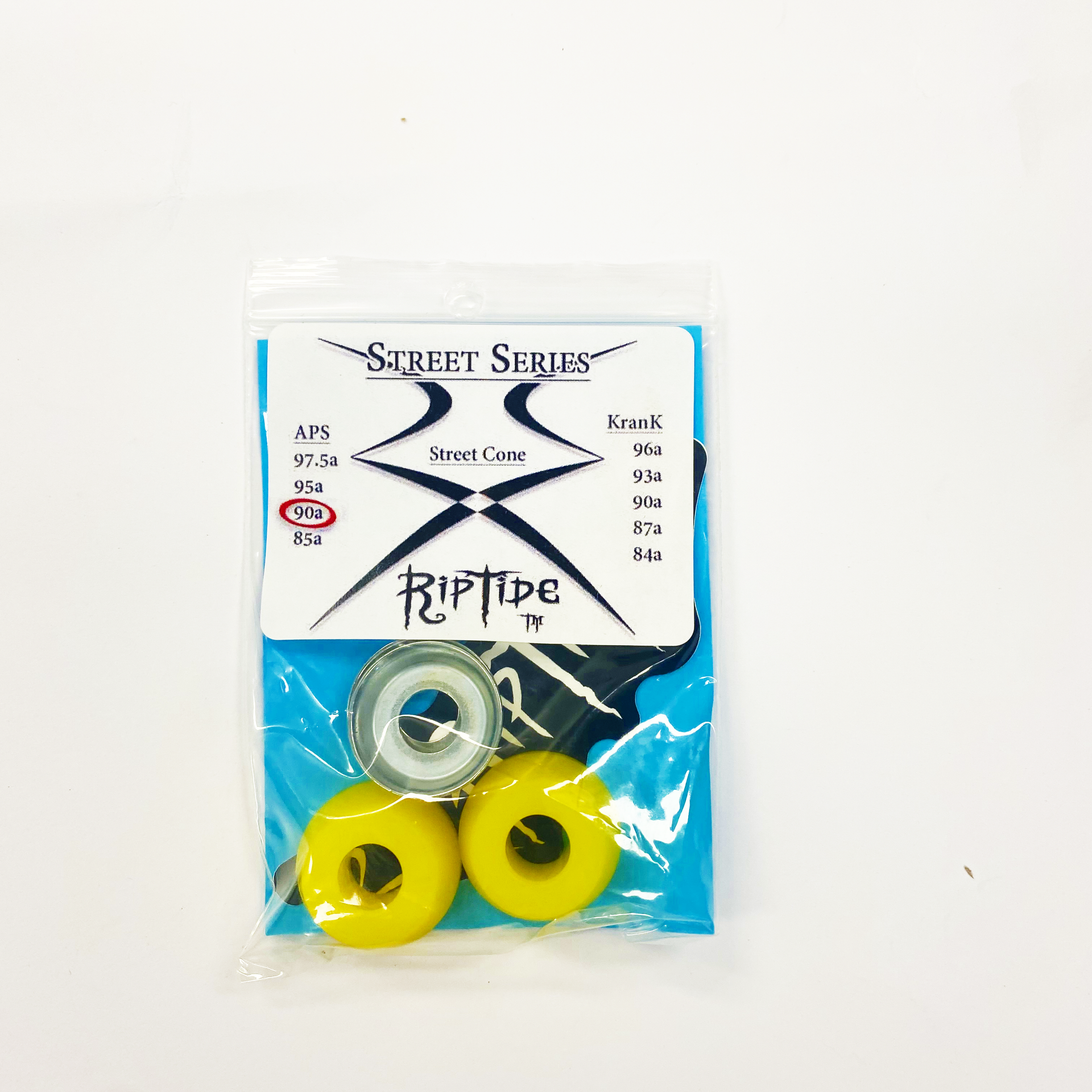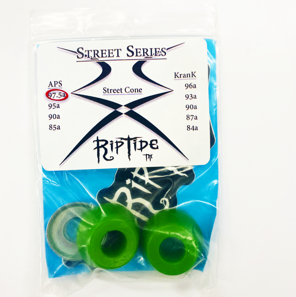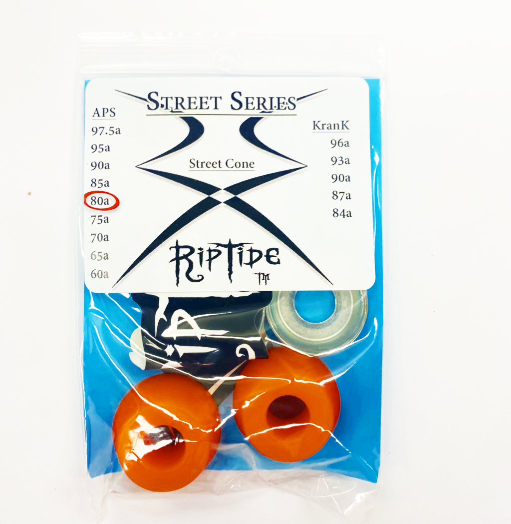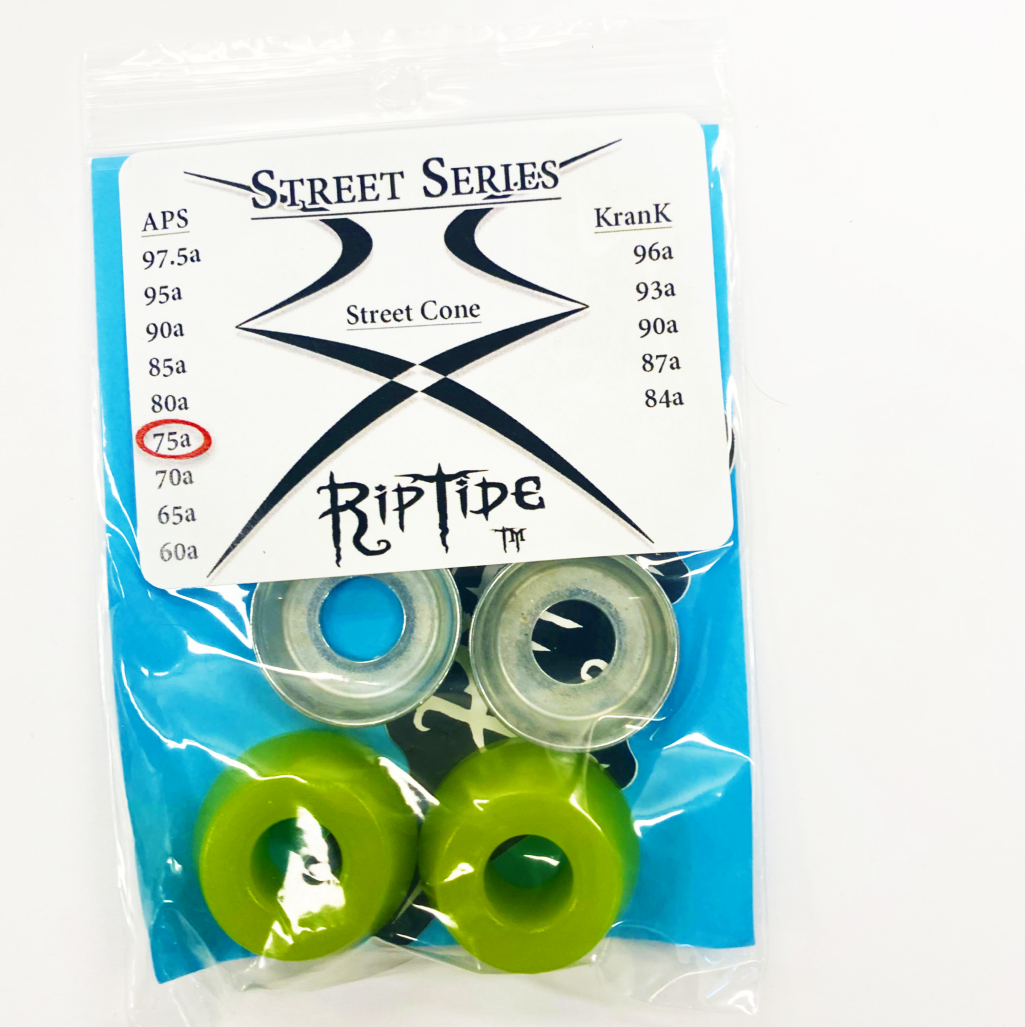 The RipTide Street-Series of bushings, for traditional kingpin trucks, was born from the desire to bring new levels of performance and innovation to skateboarding. RipTide believes that to achieve your goals in skating, you need to have a high level of control over your equipment.  If your setup performs the way you want it to, you have a much better chance of doing what you want to do - whether that means landing a seemingly impossible trick, controlling a massive drop at high speeds, dealing with rough roads, eliminating wheelbite, executing fluid moves during a vert session or pumping mad lines in the bowl.  Up until now, the rule has been to only use cones and barrels and......
