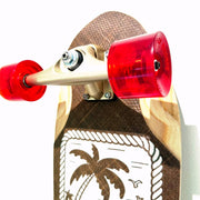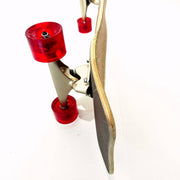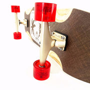Only a smaller riser has been used, but we give you the other riser in the kit incase you want bigger wheels. The wheels are clear red 62mm 3DM Seismic Cambria. This wheel was developed by slalom skaters for tight pumping. They grip, they stick and they perform like no other...plus the clear urethane, red like a ruby!!! The smaller wheels are faster for take off, get you going fast, can carver tighter and are super light.