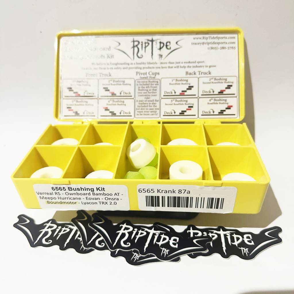 This kit is designed for Verreal RS | Ownboard | Meepo Hurricane & Flow | Eovan | Onsra | Boundmotor | Lyacon TRX 2.0 | Propel Pivot | Tynee electric skateboards that use dual kingpin trucks. Riptide has coded this kit as a 6565. This code refers to the size of the bushings in the kit. The bushings are 0.6" and 0.5" in size.