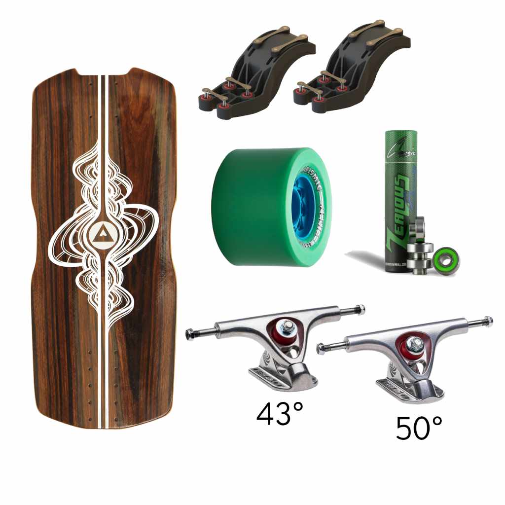 We have tested this setup and feel that it is an extremely fun board and will definitely save you a couple of hundred bucks at least with getting started. You can bring the down the 43 degree Paris an additional 15 degrees and run it as a 28-degree truck with the front around 55-60 degrees, and you’ve got yourself a super fun board that is stable in the straights, pushes like a champ and pumps quite efficiently. It is not the top performer, but it makes for a super fun pump/push hybrid setup that doesn’t break the bank.