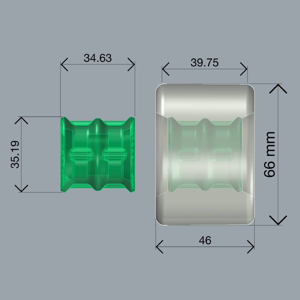 This wheel started by designing a custom core. The core features peaks and valleys that you might be accustomed to seeing in much larger downhill wheel cores, helping the urethane to stay on the hub and provide for consistent wear across the contact patch. But Pantheon did it with a core that is only slightly over 35mm in diameter, meaning you get a lot of urethane depth to play with and more bang for your buck. On the Sliders, that’s a whopping 15.4mm of urethane depth. This is actually a more standard urethane depth when compared to most 70mm slide wheels. That’s a lot of wheel. This pays you back in longevity, and it also makes the wheels feel super plush underfoot.