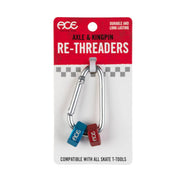 What are these? These hardened steel dies (nuts) drop into any skate tool or wrench for that matter and allow you to "chase" (re-thread) your damaged axle ends or kingpins. The carabiner is a handy way to keep track of these dies as you are sure to become the most popular person at every session when you are rockin' these.