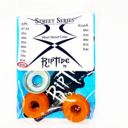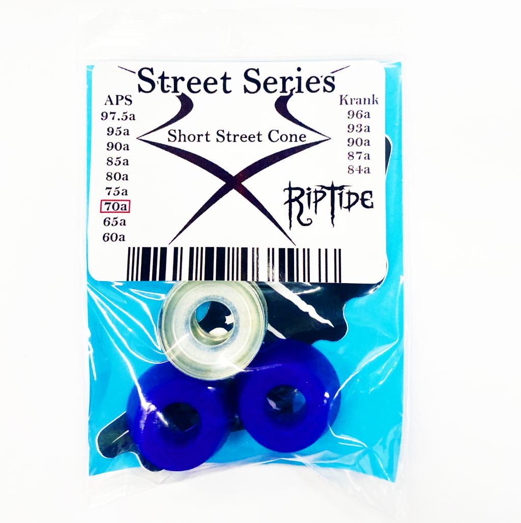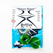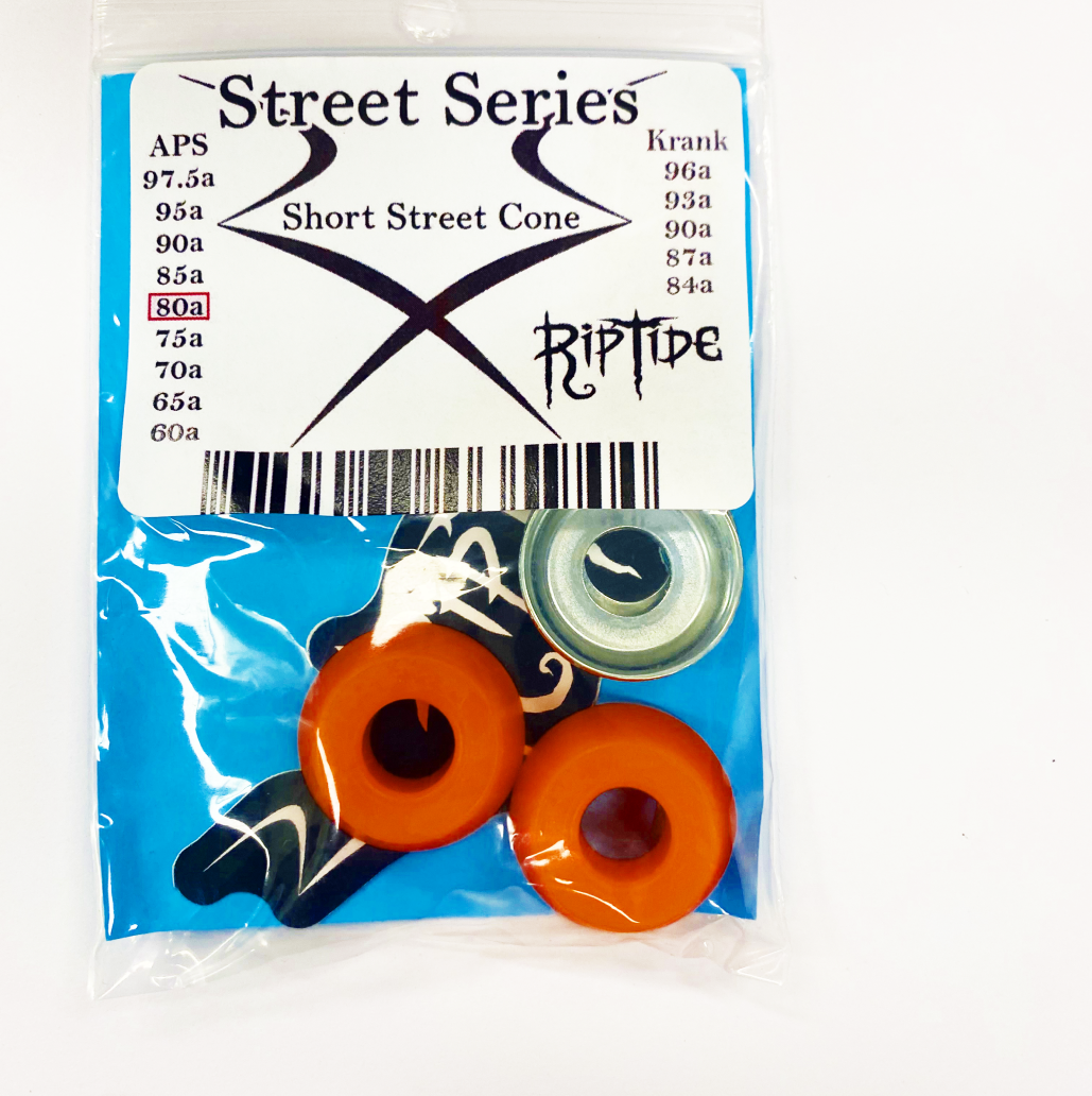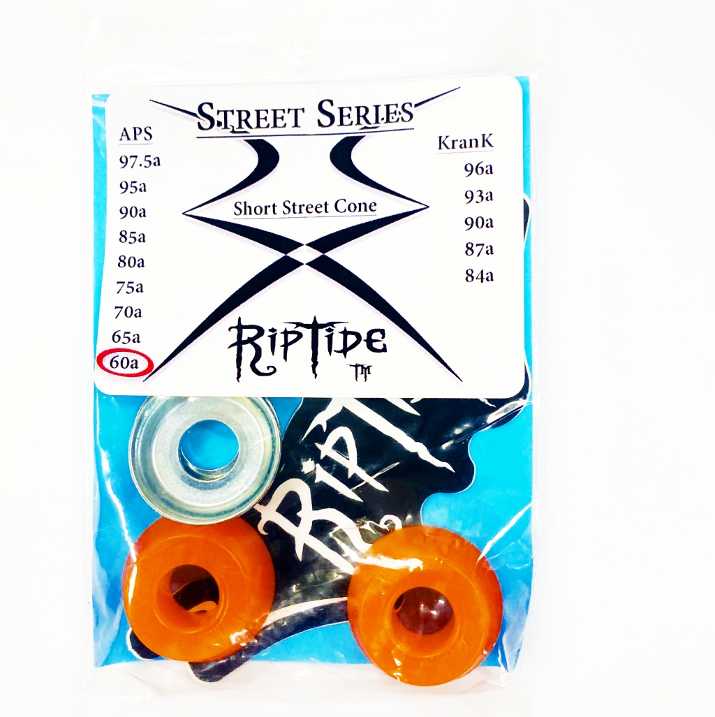The RipTide Street-Series of bushings, for traditional kingpin trucks, was born from the desire to bring new levels of performance and innovation to skateboarding. RipTide believes that to achieve your goals in skating, you need to have a high level of control over your equipment. If your setup performs the way you want it to, you have a much better chance of doing what you want to do - whether that means landing a seemingly impossible trick, controlling a massive drop at high speeds, dealing with rough roads, eliminating wheelbite, executing fluid moves during a vert session or pumping mad lines in the bowl. Up until now, the rule has been to only use cones and barrels and......